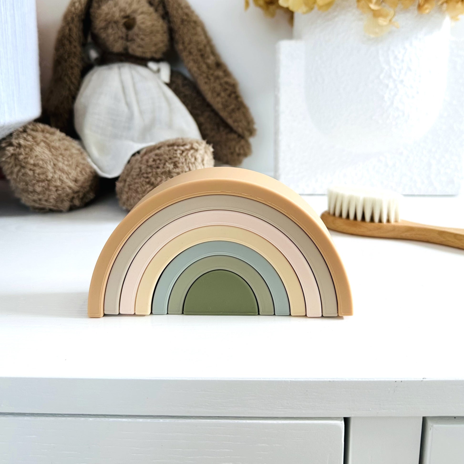 Unleash endless fun and learning with our Silicone Stackable Rainbow Puzzle. Designed to engage little minds and hands, this versatile toy is perfect for sensory play, fine motor development, memory games, and colour recognition. Crafted to support open-ended Steiner and Montessori-style play, this vibrant rainbow puzzle is the ideal "learning through play" toy for your baby.